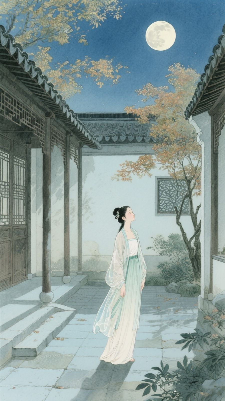 诗的开篇便以精准笔触捕捉初秋。“桂魄初生秋露微”中,“桂魄”代指初升的月亮,带着朦胧清辉划破暮色;“秋露微”则写尽露水新凝的沁凉。紧接着“轻罗已薄未更衣”,轻薄罗衣已经难抵夜寒,却迟迟未换,并非不觉寒凉,而是心思早已游离于衣衫冷暖之外,这份不经意的慵懒,好似人们对夏日的留恋与对秋日的试探。