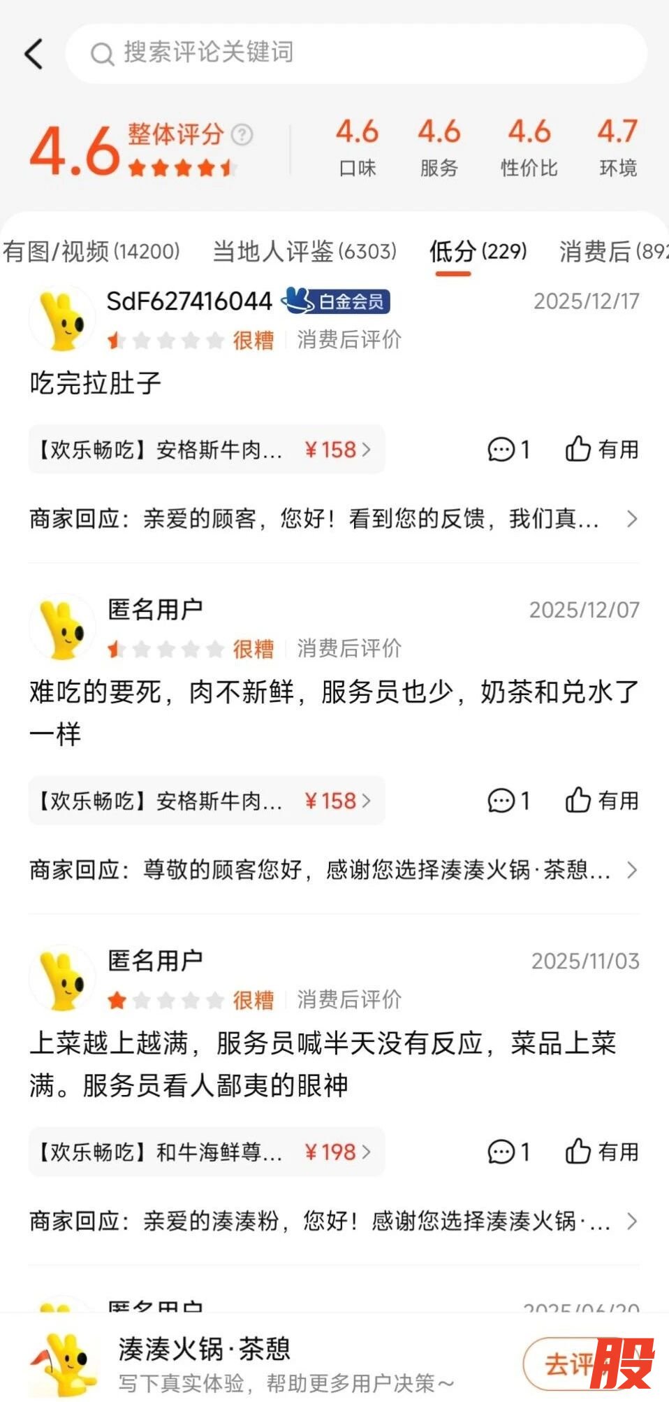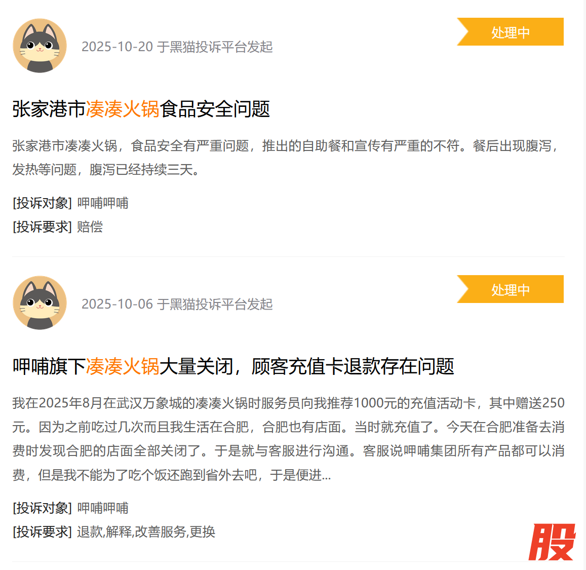 在美团等平台上,“价格贵”“菜量少”“服务差”“不卫生”已成为消费者对湊湊火锅的普遍吐槽。在黑猫投诉 【下载黑猫投诉客户端】上,关于呷哺呷哺和湊湊火锅的投诉分别超830条和80条。投诉内容包括“吃完火锅拉肚子”、服务和充值问题等。