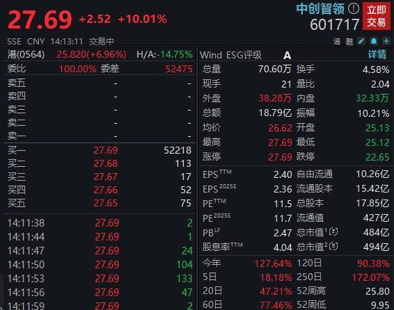 【大河财立方 记者 张战强】9月24日金牛网,中创智领A股股价盘中涨停,报27.69元/股,续创历史新高;H股同样走强,盘中一度涨超7%。消息面上,公司于9月22日晚发布两则重要公告,拟2.02亿元参与投资泓楷基金,定向投资超聚变;同时拟2.7亿元成立全资子公司,拓展热管理业务。进入9月以来,中创智领股价表现活跃,A股股价累计涨幅已达35.40%。